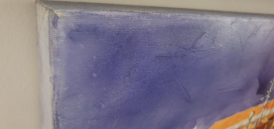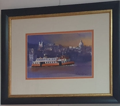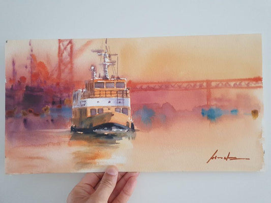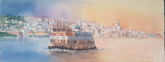 Lisboa azul e cacilheiro no rio, Águarela sobre tela original de António Neves