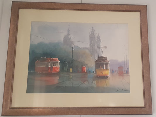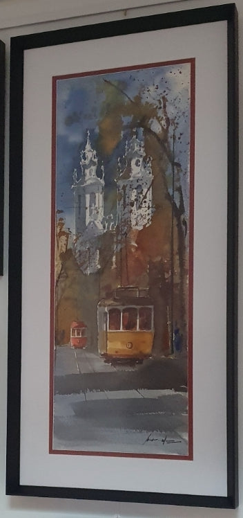 Eléctrico na Estrela, Basílica de Lisboa, Portugal, Águarela original de António Neves