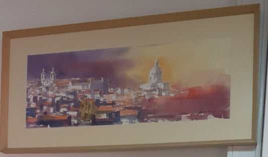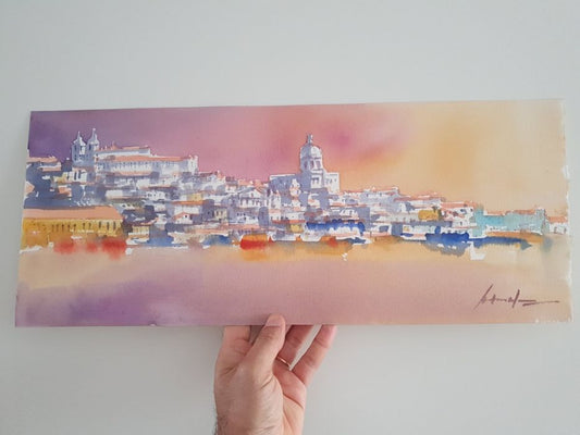 Lisboa, pôr do Sol, Portugal, Águarela original de António Neves